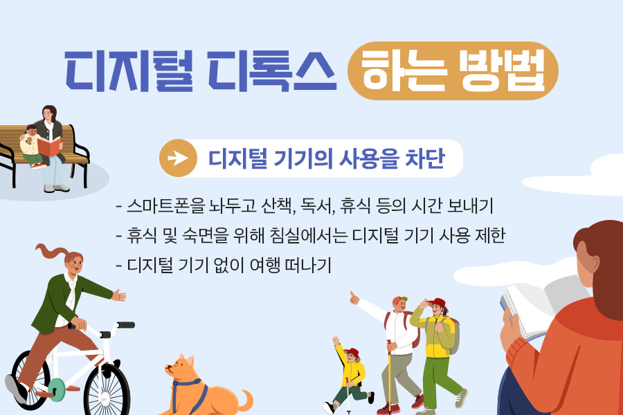 - 디지털 기기의 사용을 차단하기 위해 스마트폰을 놔두고 산책, 독서 등의 취미로 시간 보내기