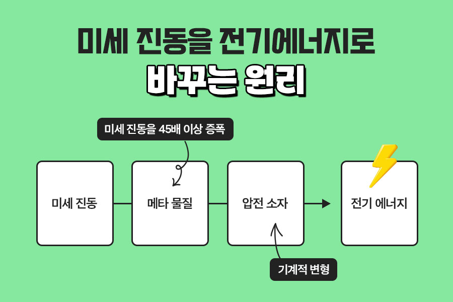 본래 일상에서 발생하는 진동 대부분은 미세하여 에너지 하베스팅을 진행하지 못하고 큰 진동이 발생하는 위치를 찾아야 하는데요. 메타 물질의 개발로 적은 양의 압전 소자를 사용할 수 있고, 기존 기술보다 네 배 이상 큰 면적에서 전력을 생산할 수 있게 되었습니다.