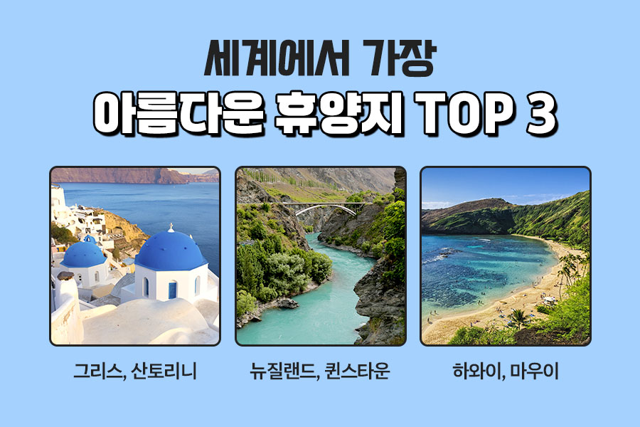 세계에서 가장 아름다운 휴양지를 하나만 꼽으라면 정말 어려운 선택이 되겠지만 후보지를 3개까지 늘린다면 비교적 쉬운 선택이 될 수 있는데요. 아래 휴양지들은 각각의 특색과 아름다움으로 매년 많은 사람이 찾는 인지도 높은 휴양지입니다.